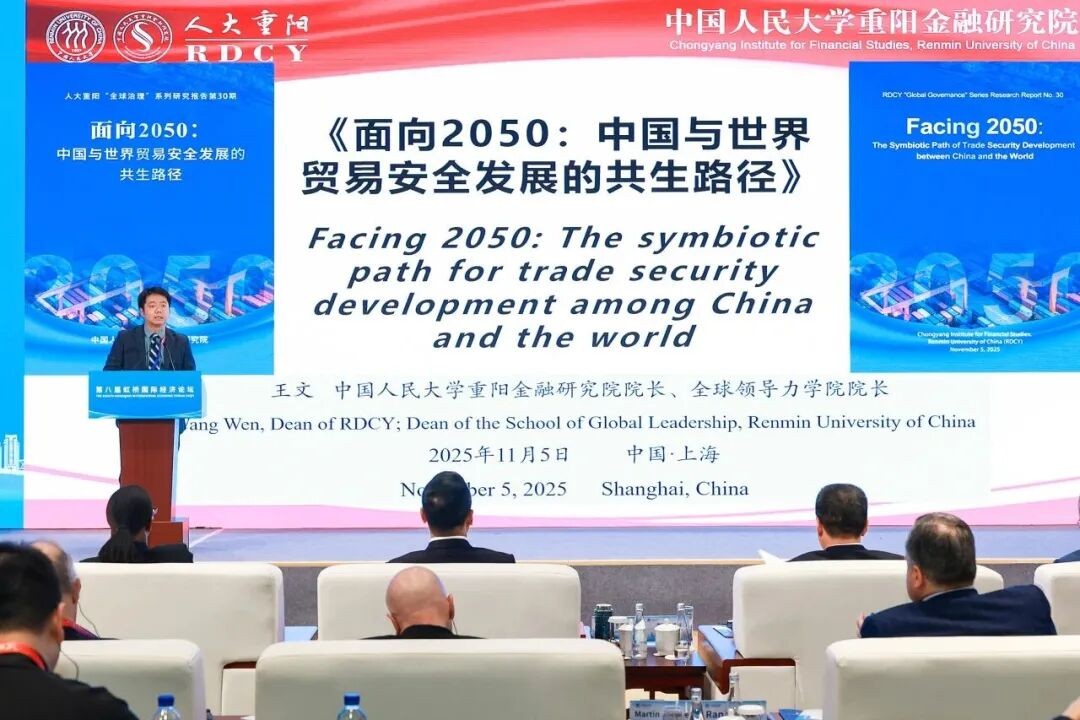 随后,中国人民大学重阳金融研究院院长、全球领导力学院院长王文发布研究报告《面向2050:中国与世界贸易安全发展的共生路径》。报告以2050年为远景目标,立足于“人类命运共同体”的宏大叙事,提出“共生型安全”作为中国与世界贸易发展的核心路径。报告强调,未来的贸易安全不仅是国家层面的战略议题,更是涉及微观企业生存、中观产业升级与宏观治理重构的复合命题。