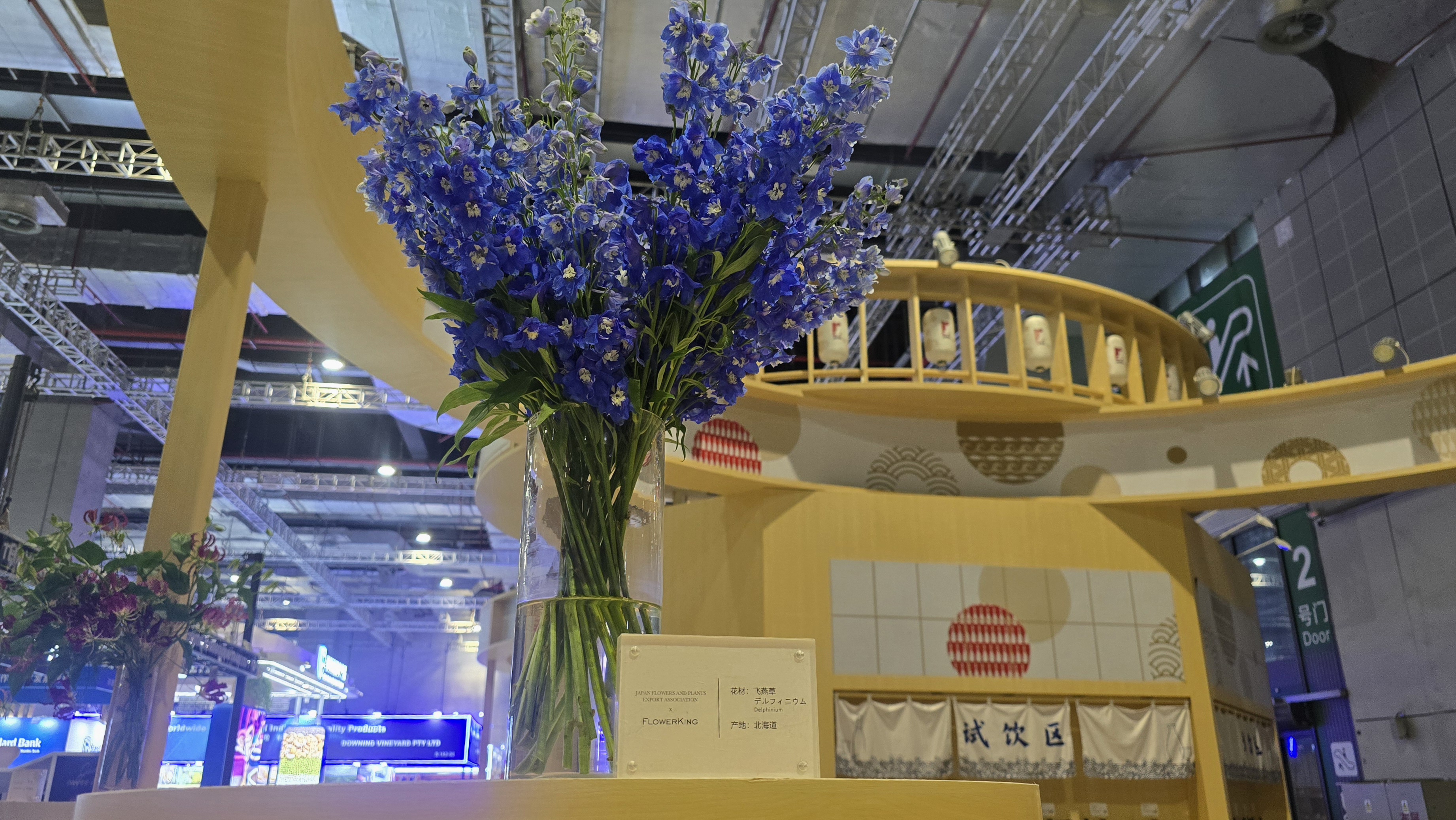 踏入农食产品展区,日本贸易振兴机构(JETRO)展台的热闹劲儿率先扑面而来——人们在围成圈的48个清酒试饮水龙头前排着小队,“这个味道不错”“给我也尝尝”的讨论声不绝于耳;转角处飘出阵阵鲜香,驻足的人群端着味噌汤、洋葱汤点头称赞;抬头望去,每个展台上方从日本空运来的鲜切花艳得晃眼,衬得整个展区别有一番日式韵味。