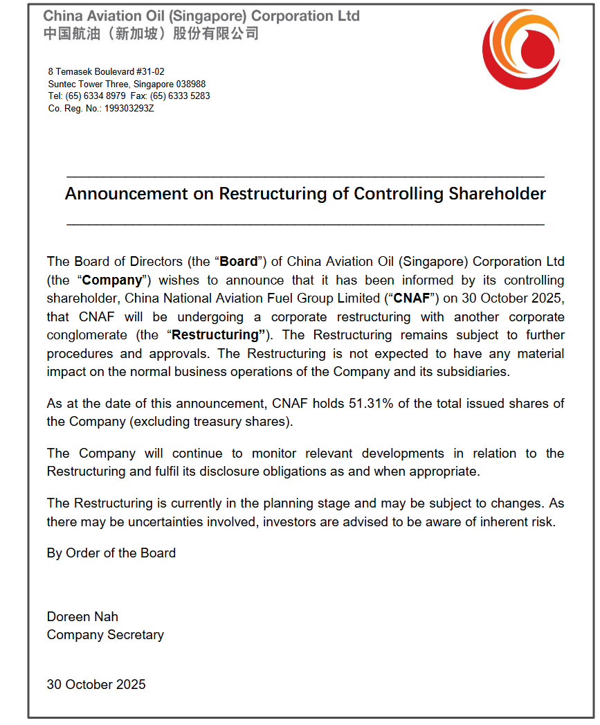 近日,中国航空油料集团有限公司旗下的中国航油(新加坡)股份有限公司发布公告称,中国航油(新加坡)董事会于2025年10月30日收到控股股东中国航油集团通知,中国航油集团将与另一家企业集团进行企业重组。