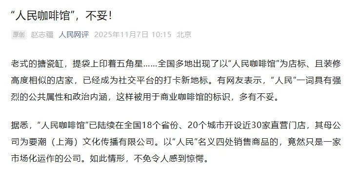 11月7日,人民网评发表评论文章《“人民咖啡馆”,不妥!》,该评论中提及: