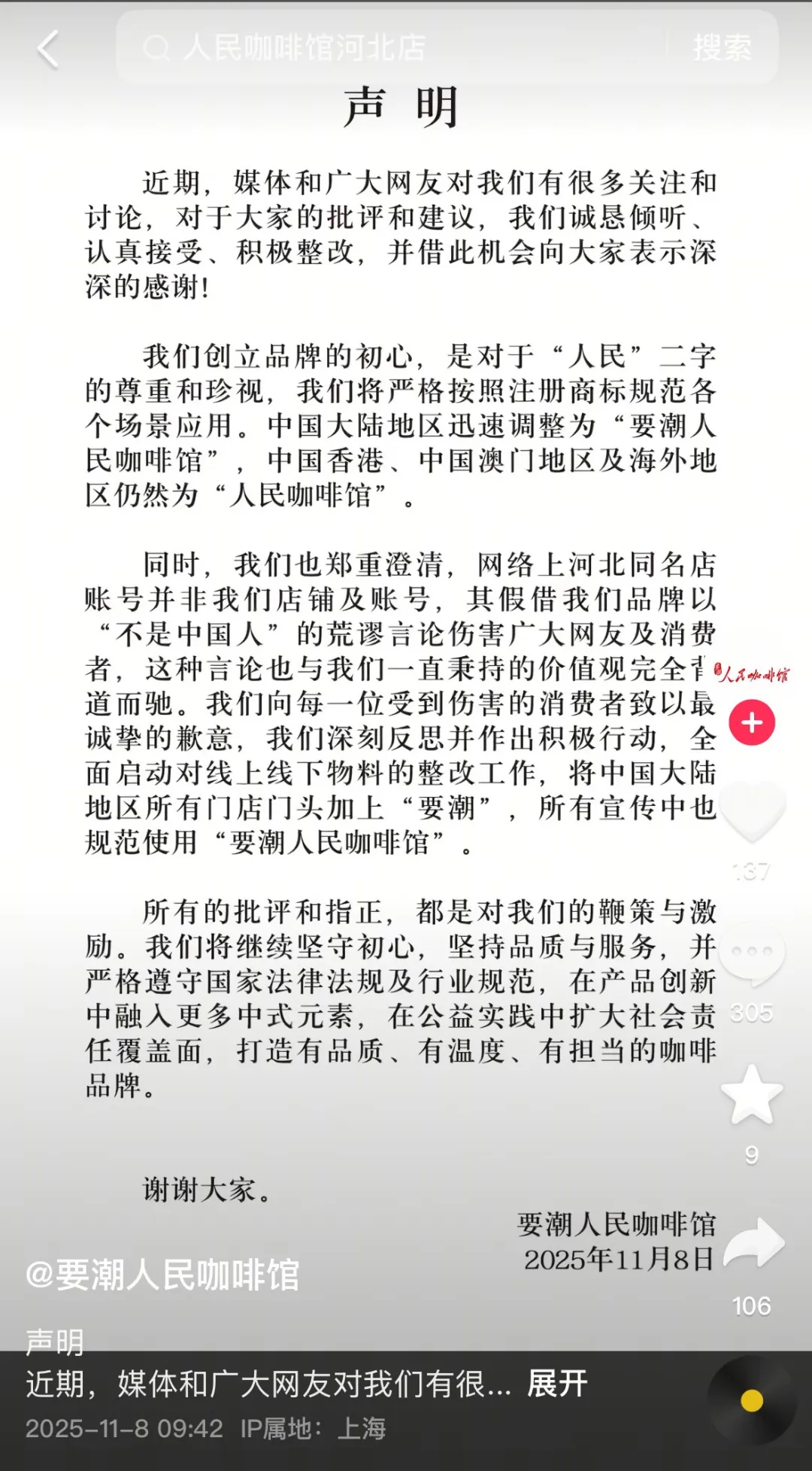 11月8日,要潮人民咖啡馆发布声明,内容如下: