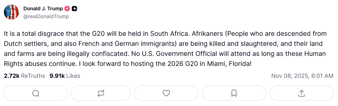 “G20峰会将在南非举行,这完全是一种耻辱,”特朗普在社交媒体上写道,并声称南非白人“正在被杀害和屠杀,他们的土地和农场正在被非法没收”。他还声称:“只要这些侵犯人权的行为继续下去,就不会有美国政府官员出席。”