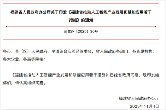 11月7日,福建省人民政府办公厅通过微信公众号“中国福建”发布关于印发《福建省推动人工智能产业发展和赋能应用若干措施》的通知。