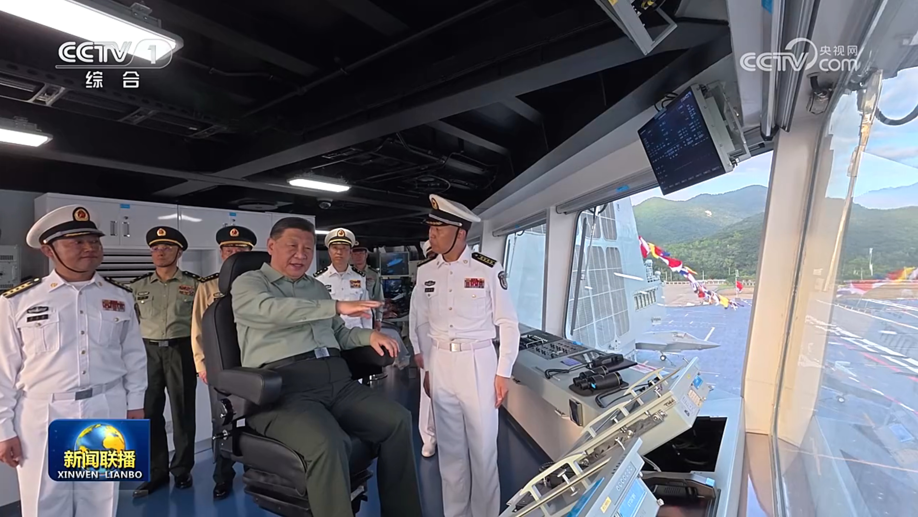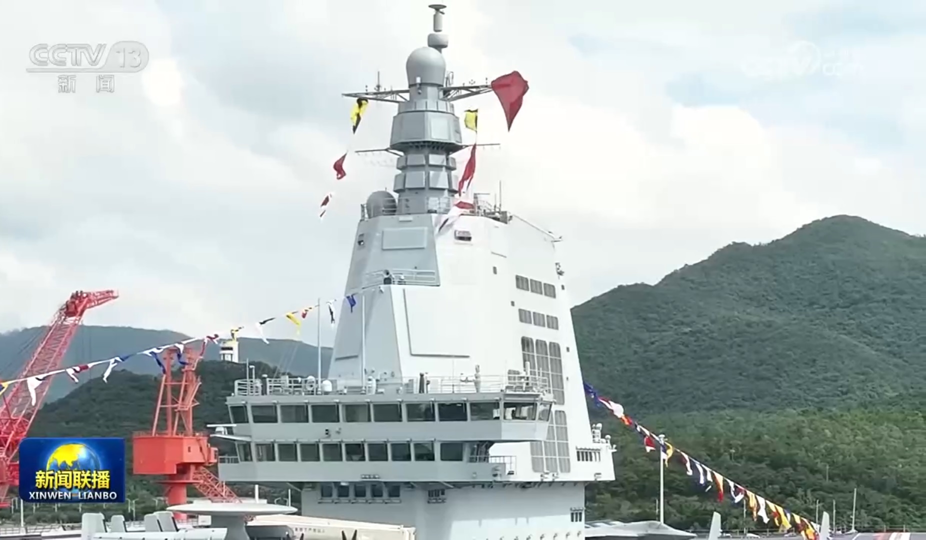 11月5日,我国第一艘电磁弹射型航空母舰福建舰入列授旗仪式在海南三亚某军港举行。中共中央总书记、国家主席、中央军委主席习近平出席入列授旗仪式并登舰视察。