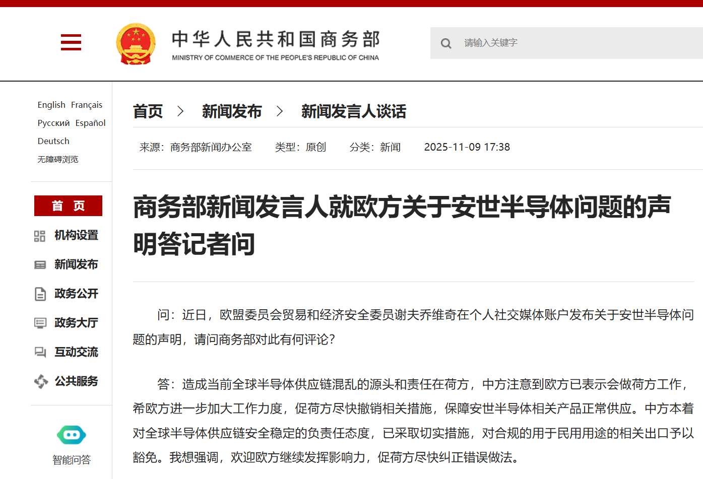 商务部网站11月9日消息,商务部新闻发言人就欧方关于安世半导体问题的声明答记者问。