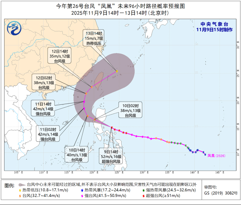根据中央气象台发布的预报,预计台风“凤凰”登陆菲律宾前强度变化不大或略有增强,穿过吕宋岛后强度明显减弱,将于10日中午前后移入南海东部海面(台风级),之后强度将有所增强,最强可达强台风级,11日开始逐渐转向北偏东方向移动,可能于12日白天在台湾岛西南部沿海登陆,之后强度快速减弱。