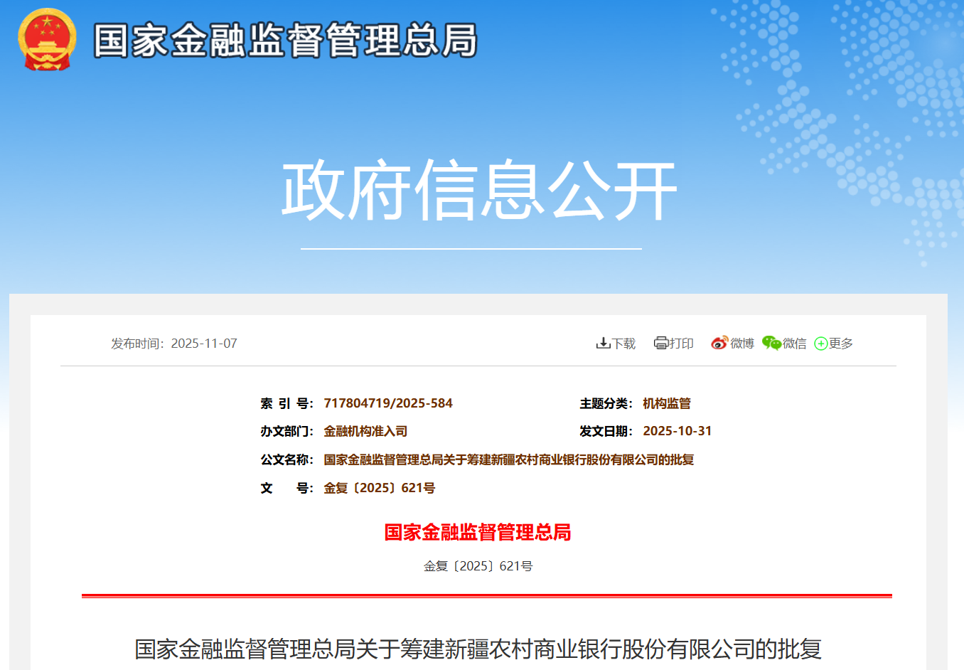 国家金融监督管理总局网站11月7日消息,国家金融监督管理总局发布关于筹建新疆农村商业银行股份有限公司的批复。