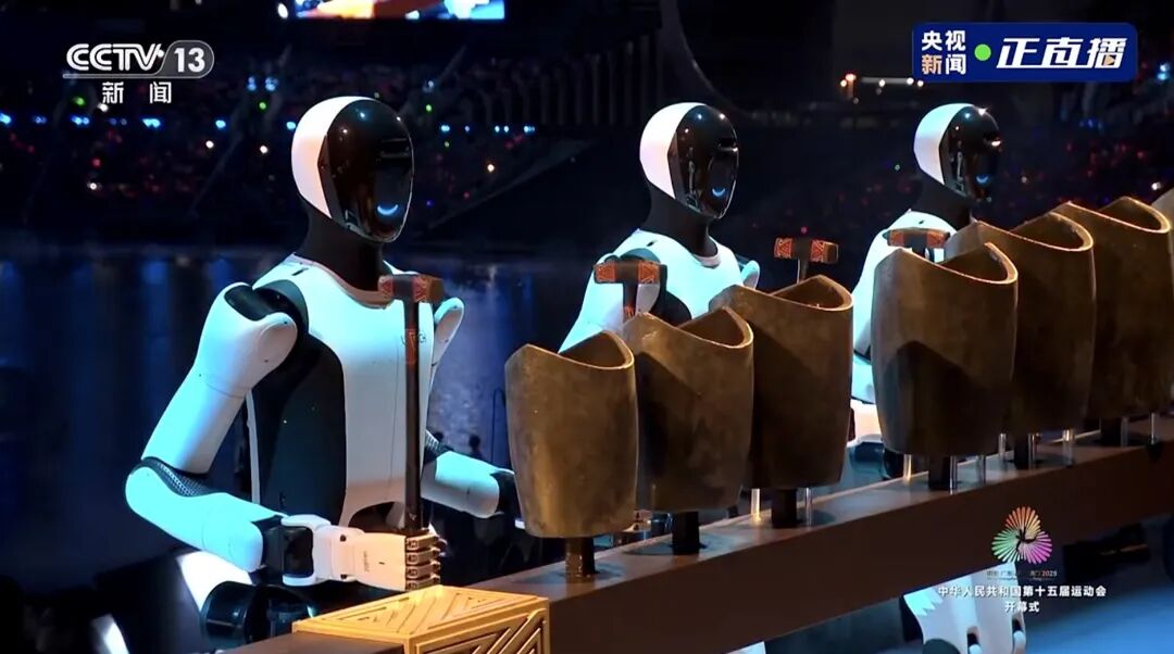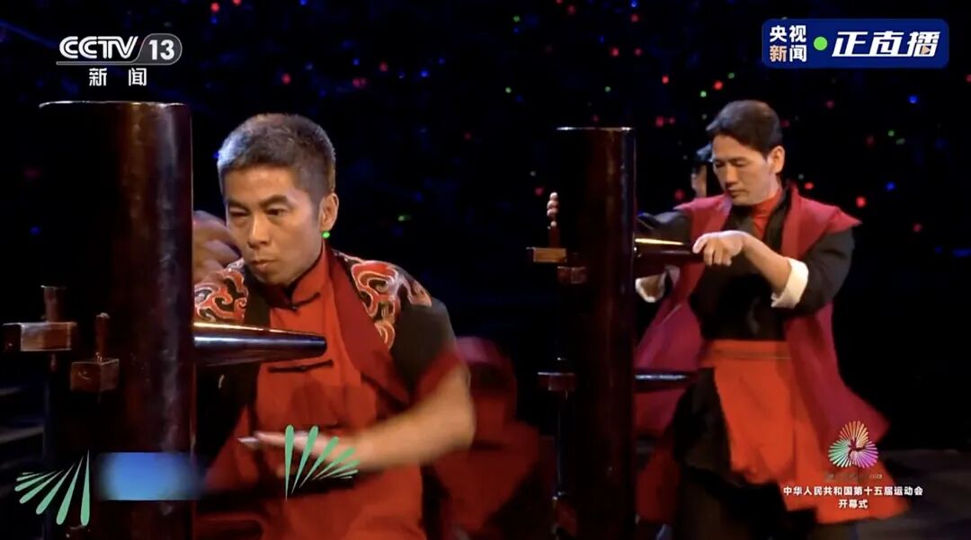 粤港澳体育代表团同步入场,智能机器人敲响青铜器,梦幻联动,粤剧声腔、英歌飒爽、南狮腾跃……岭南元素满满。