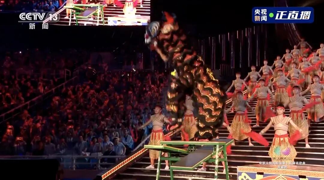 舞台上,锣鼓喧天,醒狮舞动,腾挪纵跃如凌风,夜空中几头醒狮滚动绣球与场地内的醒狮表演遥相呼应。