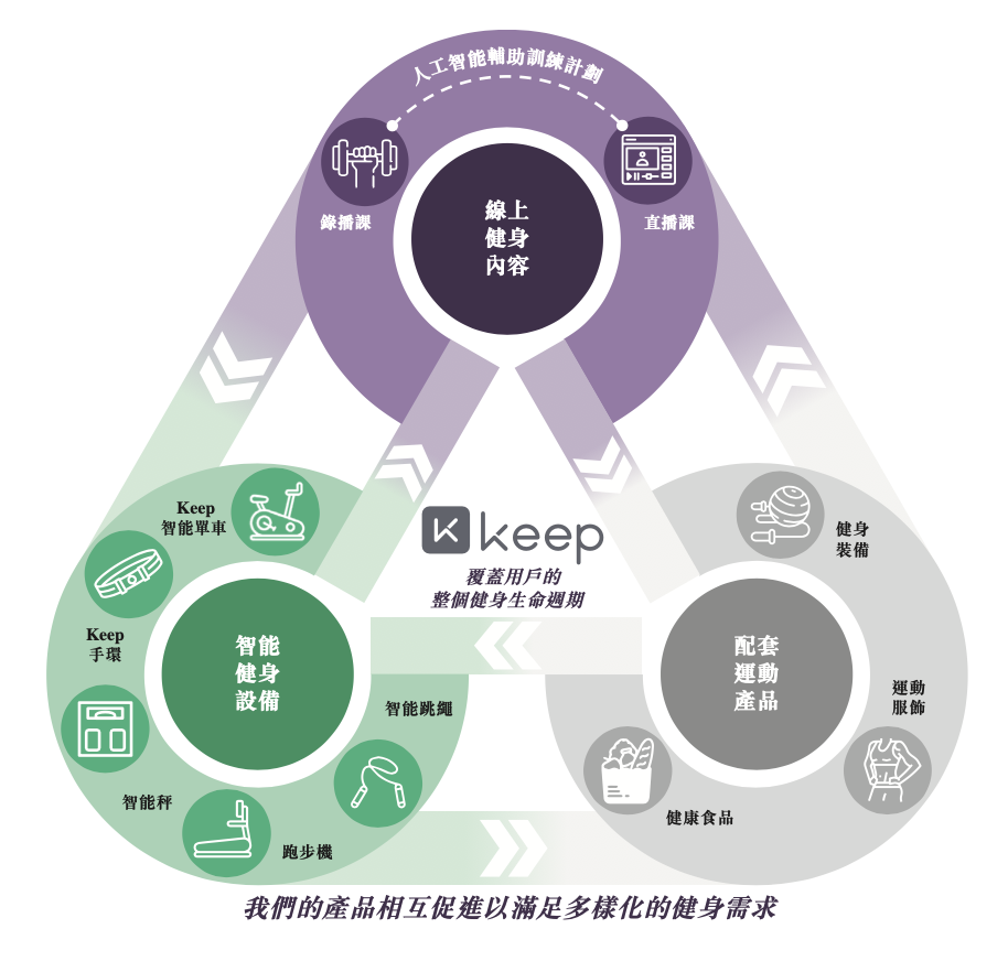 除了虚拟赛事业务,Keep在2018年用户破亿后迅速推出动感单车、手环、体脂秤乃至运动服饰进入硬件和消费品赛道,还在同年开始线下运动空间Keepland的探索。