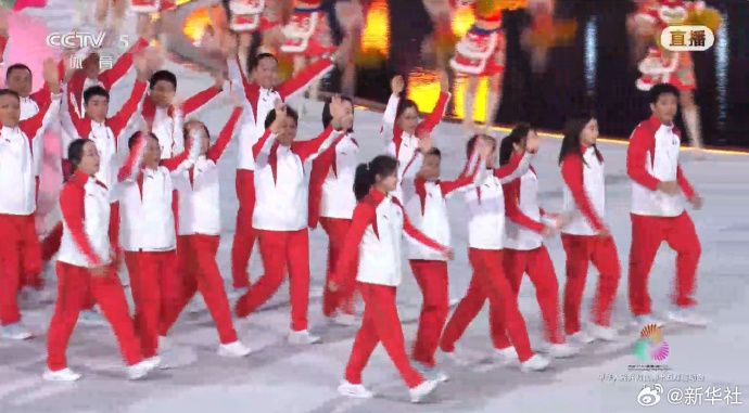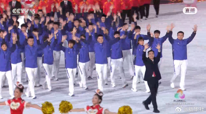 十五运会吉祥物“喜洋洋”、“乐融融”欢乐相伴,身着极具岭南风韵广绣服装的引导员,手持彰显中华传统文化雅和之美团扇造型的引导牌,引领代表团入场。