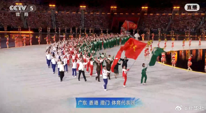 身着极具岭南风韵广绣服装的引导员,手持团扇造型的引导牌,引领本届全运会东道主广东、香港、澳门体育代表团入场。这是粤港澳三地首次携手承办全运会。