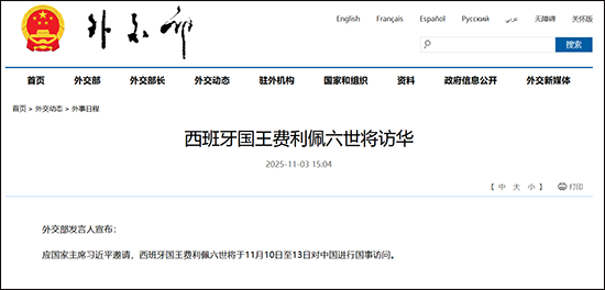 外交部网站此前11月3日消息,应国家主席习近平邀请,西班牙国王费利佩六世将于11月10日至13日对中国进行国事访问。