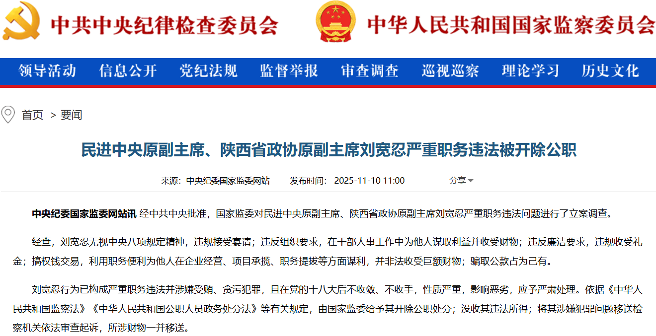 据中央纪委国家监委网站11月10日消息,经中共中央批准,国家监委对民进中央原副主席、陕西省政协原副主席刘宽忍严重职务违法问题进行了立案调查。