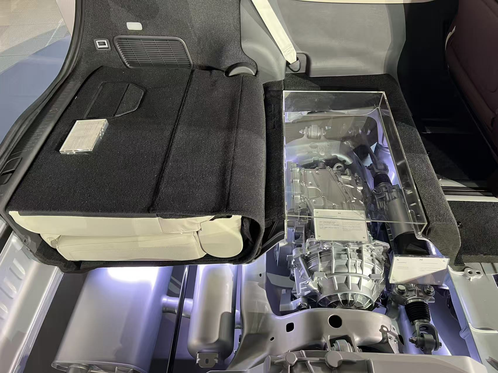 除动力系统外,X9超级增程在空间和结构布局上也进行了调整。其后桥采用超高集成度的9合1模块化设计,将传动系统、悬架、油箱、排气、后轮转向等多个组件集中排列,以提高车内空间利用率。根据小鹏公布的数据,后舱空间利用率达95.8%,三排座椅采用电动折叠结构以支持多用途场景使用。