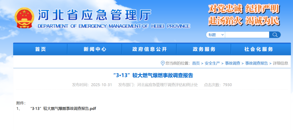 11月8至9日,有媒体报道,河北省应急厅官网公布了《“3·13”较大燃气爆燃事故调查报告》。