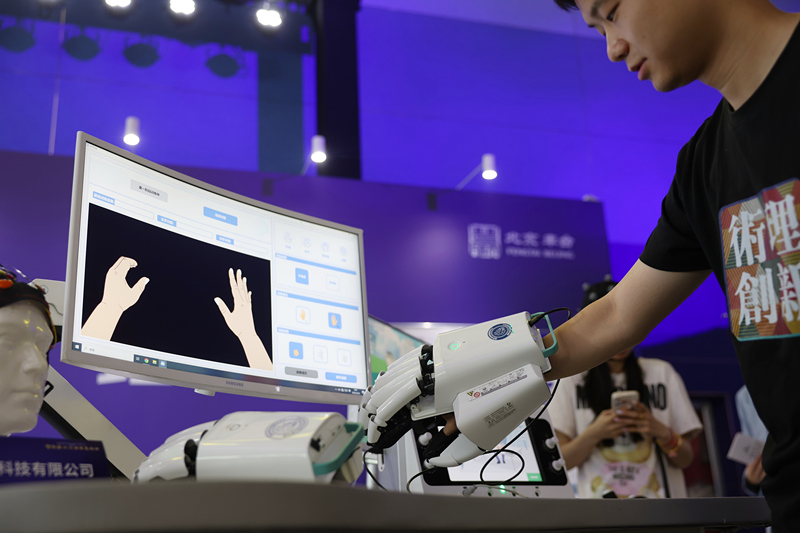 2025年6月26日,北京,工作人员在第二届智能医工产业创新发展大会上展示脑机接口上肢康复设备. 东方IC