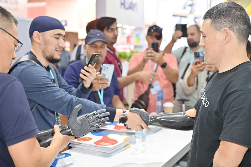2024年10月17日,广东广州,第136届广交会一展位的工作人员佩戴脑机接口智能仿生手与境外采购商握手。 东方IC