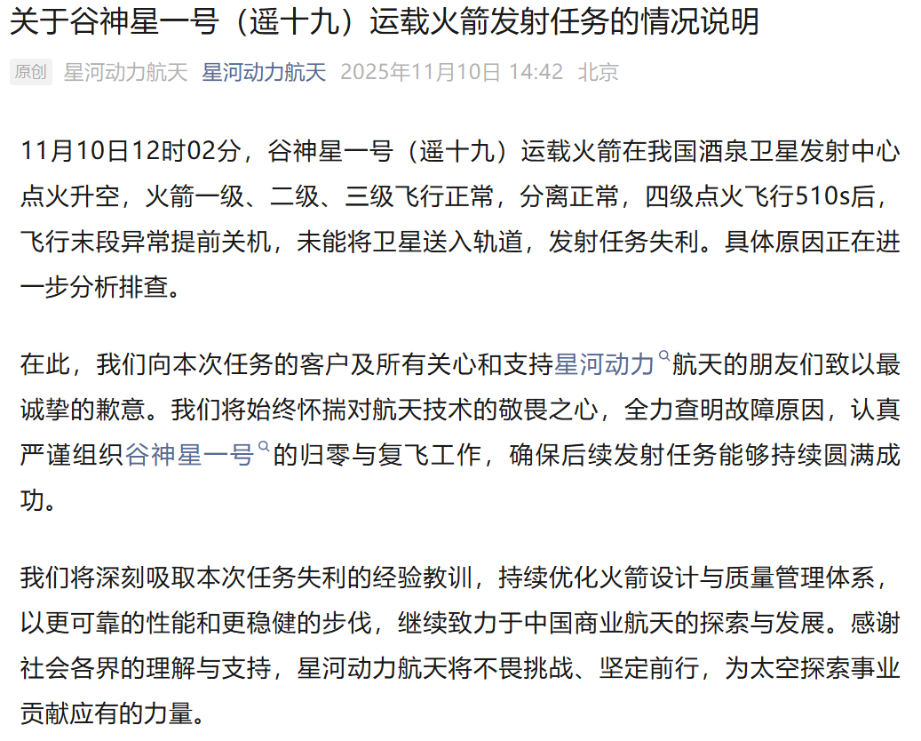 11月10日,星河动力航天发布关于谷神星一号(遥十九)运载火箭发射任务的情况说明: