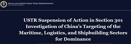 当地时间11月9日,美国贸易代表办公室(USTR)网站发布公告,宣布暂停针对中国海事、物流及造船业的301调查相关措施。
