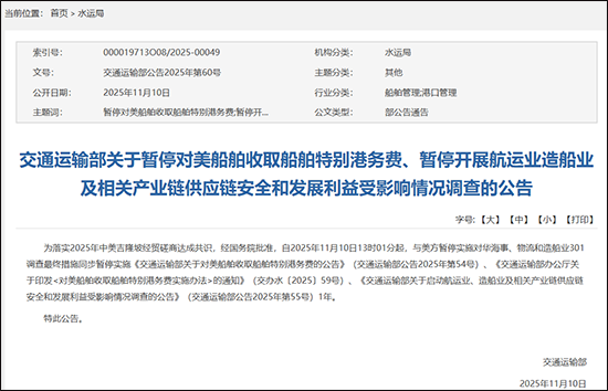 为落实2025年中美吉隆坡经贸磋商达成共识,经国务院批准,自2025年11月10日13时01分起,与美方暂停实施对华海事、物流和造船业301调查最终措施同步暂停实施《交通运输部关于对美船舶收取船舶特别港务费的公告》(交通运输部公告2025年第54号)、《交通运输部办公厅关于印发<对美船舶收取船舶特别港务费实施办法>的通知》(交办水〔2025〕59号)、《交通运输部关于启动航运业、造船业及相关产业链供应链安全和发展利益受影响情况调查的公告》(交通运输部公告2025年第55号)1年。