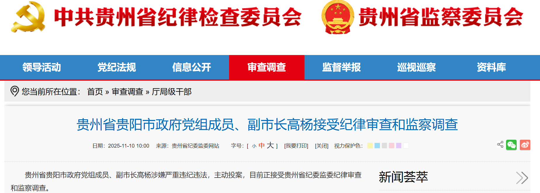 贵州省纪委监委网站11月10日通报,贵州省贵阳市政府党组成员、副市长高杨涉嫌严重违纪违法,主动投案,目前正接受贵州省纪委监委纪律审查和监察调查。