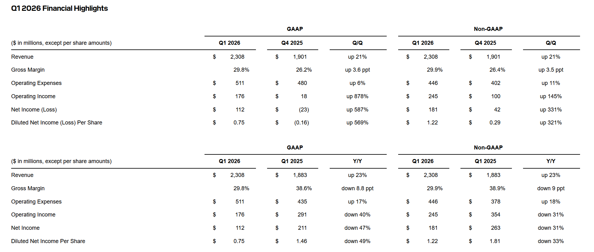 闪迪在当地时间11月6日公布截至10月3日的2025财年第一季度业绩报告,经调整后每股收益为1.22 美元,营收达23.1亿美元。此前分析师预期该季度每股收益为0.88美元,营收21.5亿美元。