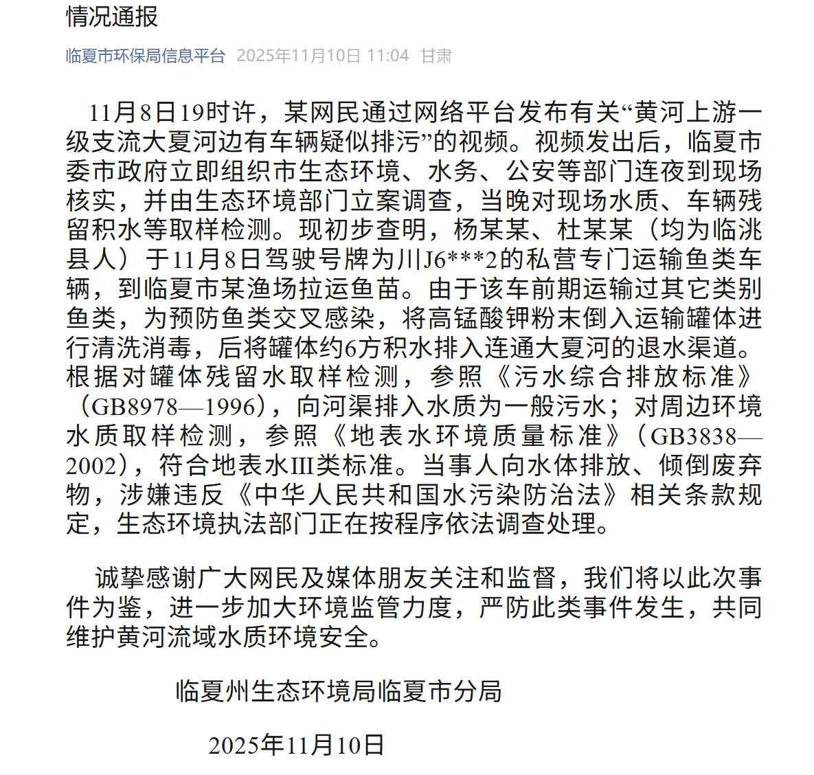 甘肃临夏官方通报“罐车在大夏河排放不明液体”:水质为一般污水,当事人被调查
