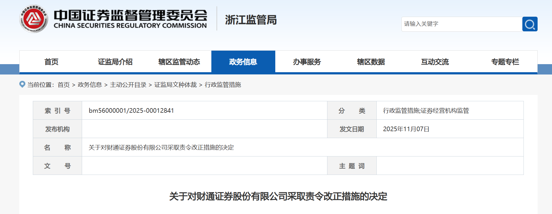 近日,浙江证监局发布《关于对财通证券股份有限公司采取责令改正措施的决定》。