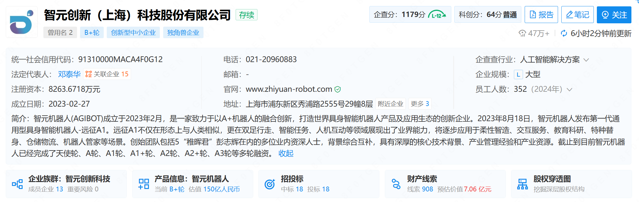 11月10日,企查查APP显示,近日,智元机器人关联公司智元创新(上海)科技有限公司发生工商变更,企业名称变更为智元创新(上海)科技股份有限公司,同时企业类型同步由有限责任公司(外商投资、非独资)变更为股份有限公司(港澳台投资、未上市)。