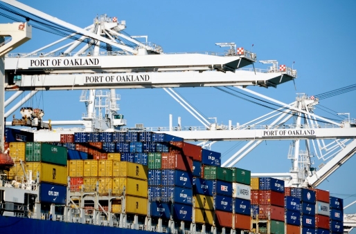 满载集装箱的货船停靠在美国加州奥克兰港。 奥克兰港网站