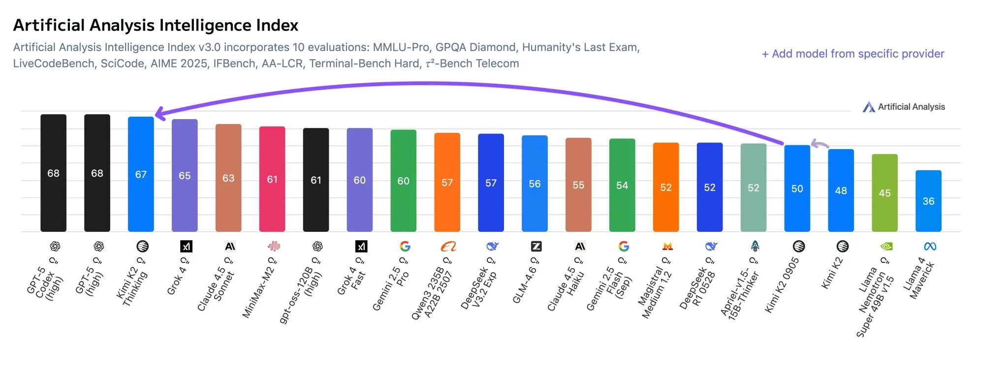 在专业机构 Artificial Analysis 智能体工具的调用测试中,Kimi K2 Thinking的得分达到93%,是目前第三方机构测量到的最高分;在智能指数中,则以67分排名第3,仅次于GPT5。