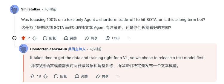 11月11日深夜,月之暗面月之暗面联合创始人兼CEO杨植麟,以及联合创始人周昕宇和吴育昕,在Reddit举办了一场AMA (Ask Me Anything,问我任何事),回应了诸多外界的关注内容。