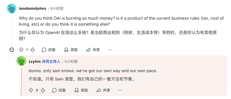 甚至有网友问到为什么OpenAI会烧那么多钱,杨植麟更是坦言“我不知道”。