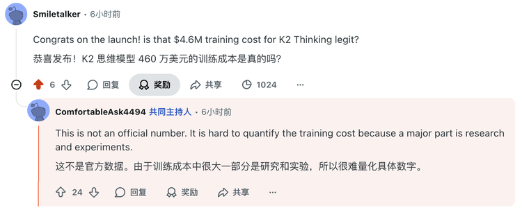 对于大家最关心的训练成本问题,杨植麟直接坦言460万美元不实。