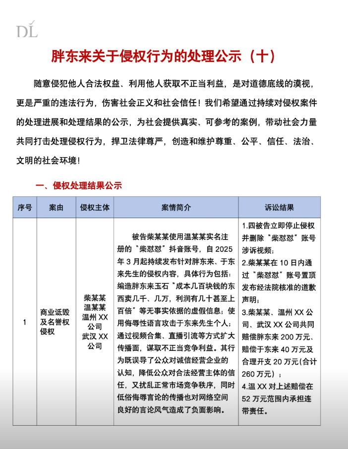 公示显示,被告柴某某使用温某某实名注册的“柴怼怼”抖音账号,自2025年3月起持续发布针对胖东来、于东来的侵权内容,具体行为包括:编造胖东来玉石“成本几百块钱的东西卖几千、几万,利润有几十甚至上百倍”等无事实依据的虚假信息;使用侮辱性语言攻击于东来个人;通过视频合集、直播引流等方式扩大传播面,谋取不正当竞争利益。其行为既误导了公众对诚信经营企业的认知,降低公众对合法经营主体的信任,又扰乱正常市场竞争秩序,同时低俗侮辱言论的传播也对网络空间良好的言论风气造成了负面影响。