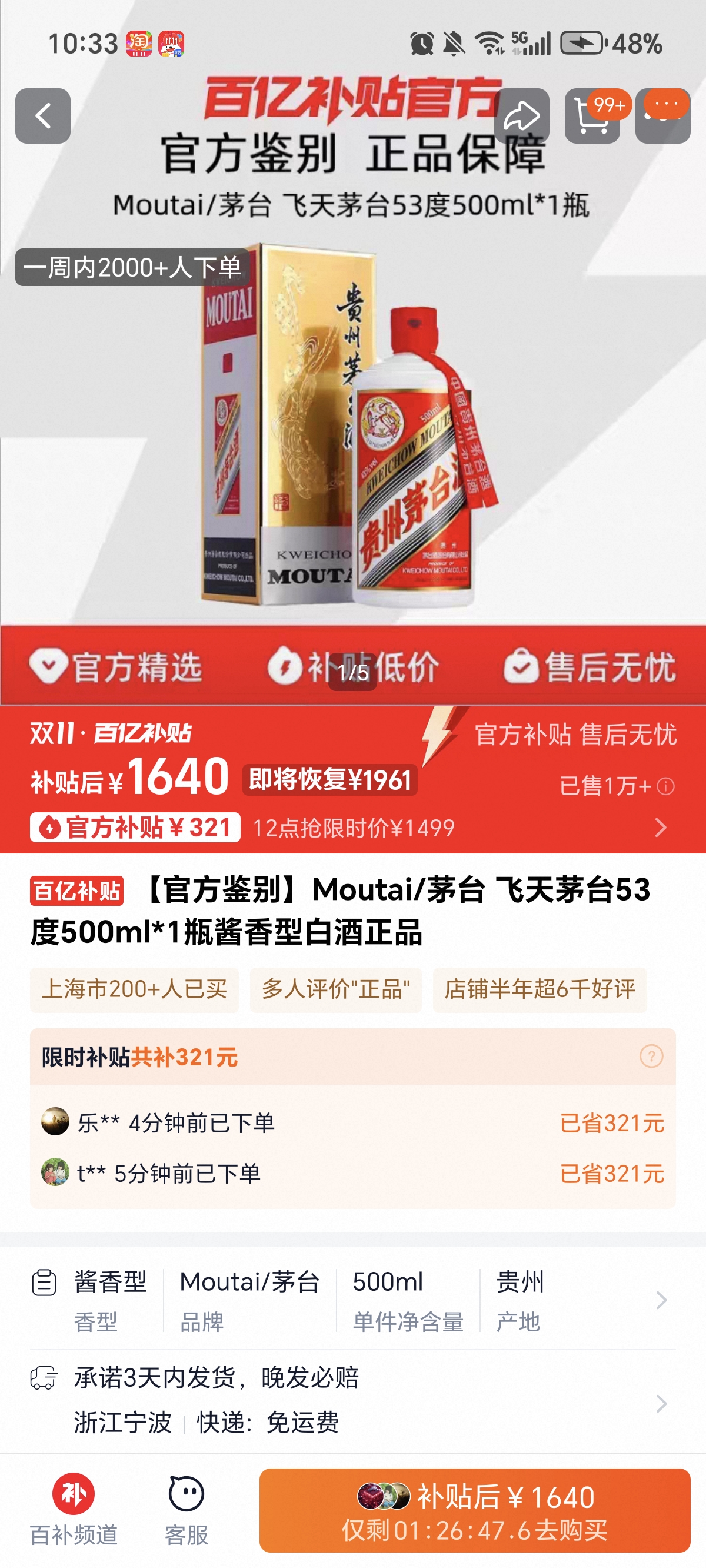 11月大促进入冲刺阶段,散飞价格接连跌破多个重要关口,各大电商平台的补贴大战更是让价格“卷至地板”。11月4日,拼多多“百亿补贴”后散飞价格首次跌破1600元,报1590元/瓶;次日,该平台双瓶装散飞补贴后折合单瓶1585元,持续刷新低价。