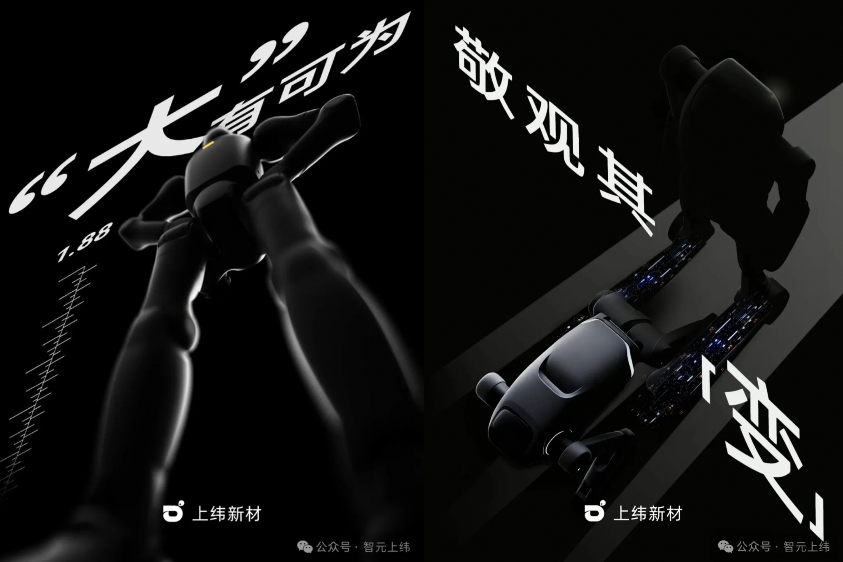 具体来看,在官方发布的内容中包含两张图片,第一张图片以黑色为背景,呈现了一个机器人的形象,上方有白色的“大有可为”文字以及“1.88”和刻度线,底部有“上纬新材”的标识,第二张图片也展示了具有科技感的机器人形象,配有白色的 “敬观其变” 文字。