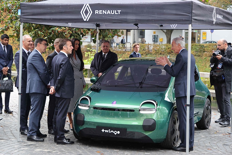 当地时间10月21日,斯洛文尼亚卢布尔雅那,法国总统马克龙和斯洛文尼亚总理罗伯特·戈洛布出席欧洲汽车竞争力活动,雷诺集团监事会主席让-多米尼克·塞纳德介绍将在斯洛文尼亚生产的雷诺电动Twingo车型。视觉中国
