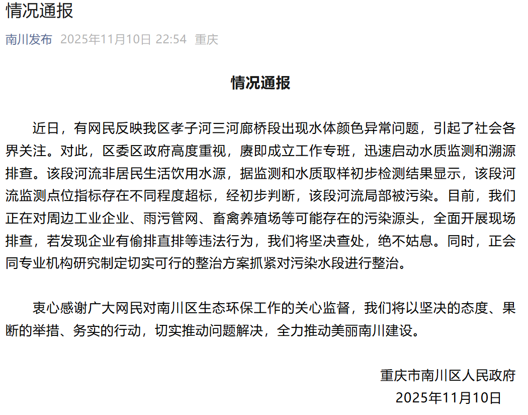 据微信公众号“南川发布”消息,11月10日深夜,重庆市南川区人民政府发布情况通报: