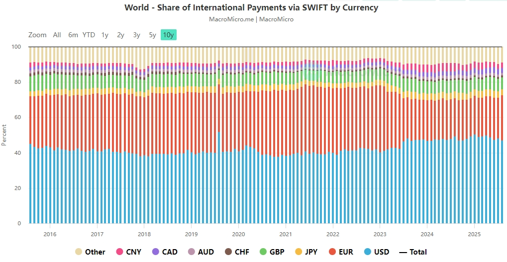 在国际上,美国通过SWIFT渠道控制国际货币交易,最新美元份额约47%,表面上不错。人民币份额从2024年7月最高的4.74%跌至2025年8月的2.93%,“国际化”进展似乎不佳。但这是因为人民币主动与SWIFT部分脱钩,“不和美国玩了”,转而用自家的CIPS支持国际贸易与金融交易,2020-2024年处理金额分别为45、80、97、123、175万亿人民币,2025年上半年90.19万亿元,同比增长约42%。