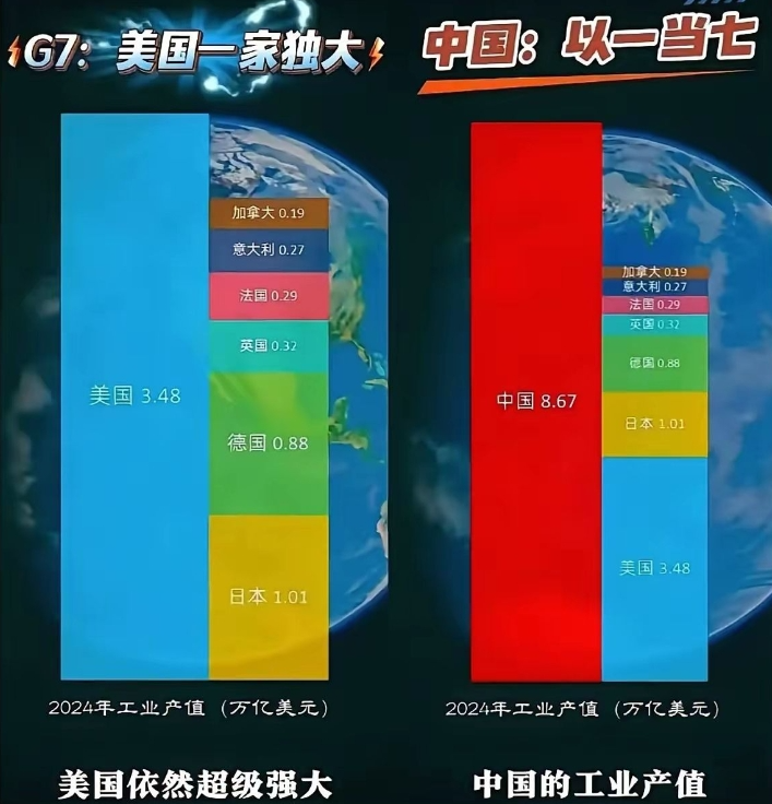 美国需要与西方阵营协调应对冲击,盟友被美国打劫不愿意出力,多个领域进展不佳,G7已经不再有决定世界经济的能力。美国工业实力“依然强大”是一种假象,制造业衰败迹象明显,美国统计局搞了不少统计花招维持数值,美国内部的揭发文章都有了。而中国只靠自身实力就能硬扛G7,多个产业是全球的支配性力量。