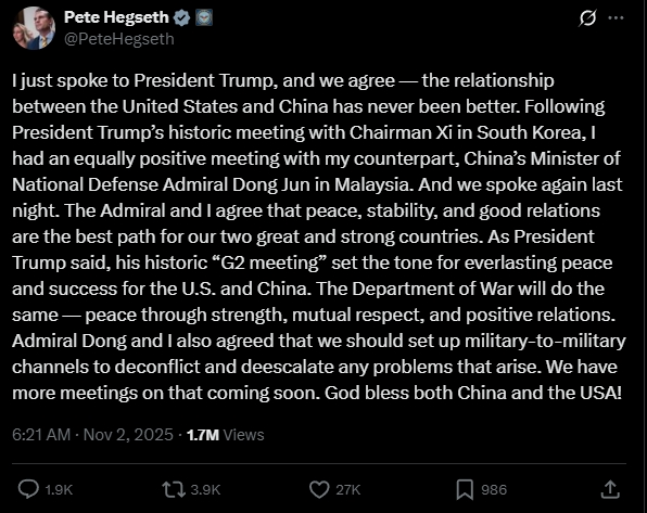 釜山会晤前,特朗普甚至玩起了“G2概念”,对中方放了一些热情的话,会后则声称中美关系“前所未有地好”。美国国防部长赫格塞思与中国国防部长董军会谈后,11月2日也发帖呼应了特朗普的“G2”论调。