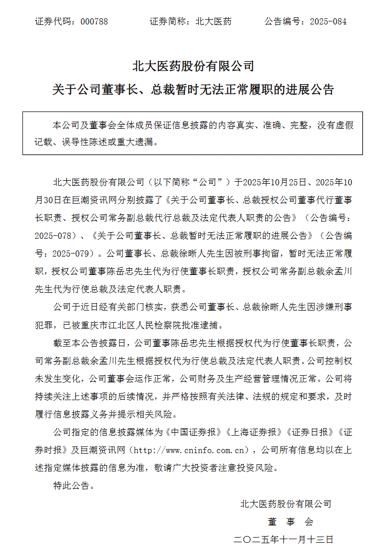 北大医药股份有限公司11月12日发布公告称,公司于近日经有关部门核实,北大医药公司董事长、总裁徐晰人因涉嫌刑事犯罪,已被重庆市江北区人民检察院批准逮捕。