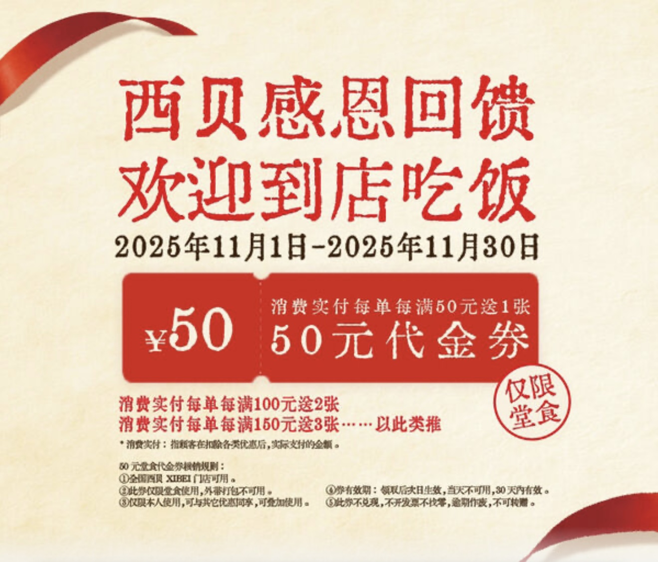 10月9日,西贝再次加码“满50元送50元券”活动,此举之后,部分门店甚至出现火爆排队的景象。11月7日,活动还在继续,西贝公众号发文称“到店消费实付每满50元送50元”,有效期至11月30日。