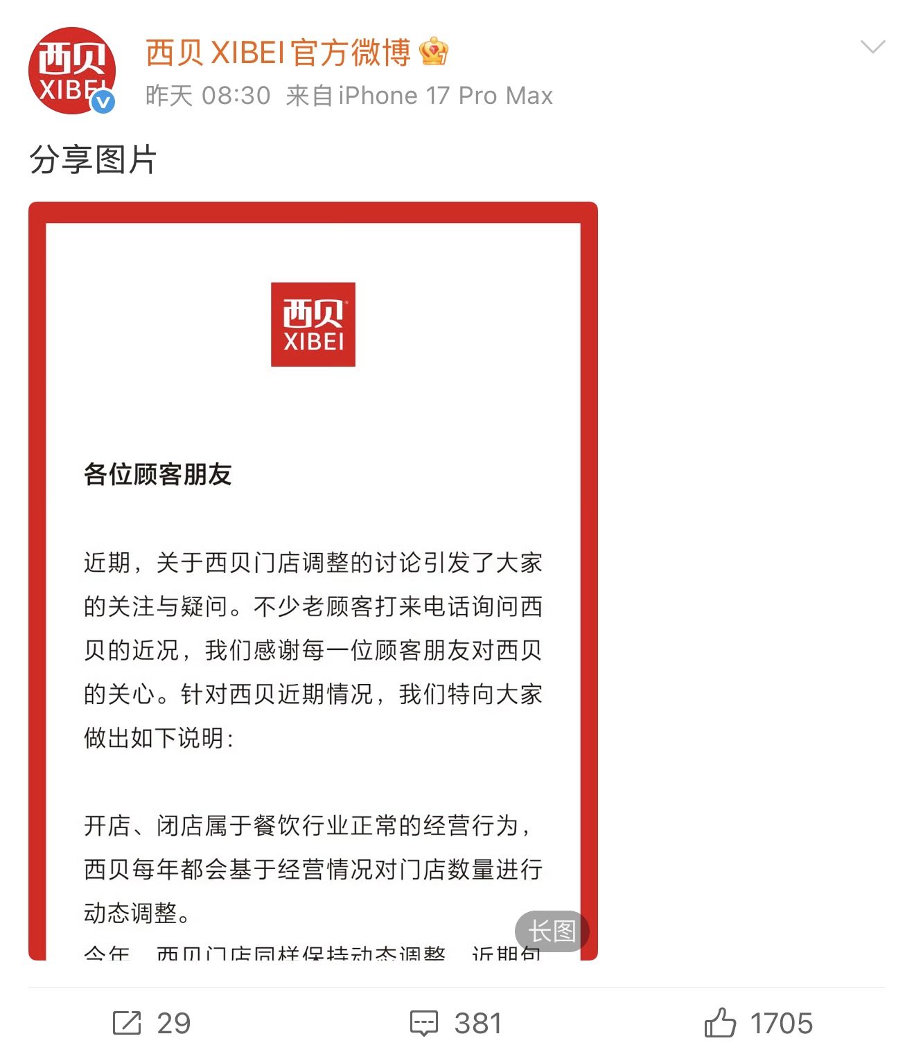 对此,西贝官方发布最新说明:开店、闭店属于餐饮行业正常的经营行为,西贝每年都会基于经营情况对门店数量进行动态调整。今年,西贝门店同样保持动态调整,近期包括深圳、汕头、义乌等地门店闭店,均属于正常调整范畴。