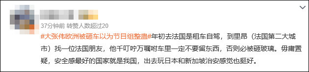 尽管大张伟本人以一种“戏谑”的语气道出了这段事实上并不愉快的往事,为其添上了一些“黑色幽默”的色彩,但这一事件引发了网友的广泛关注。许多网友认为事件“离谱中带笑”,并提到类似事件“在国内难以想象”。但也有不少网友分享自己在欧洲遭遇类似砸车盗窃的经历,引发对部分欧洲城市治安问题的关注。