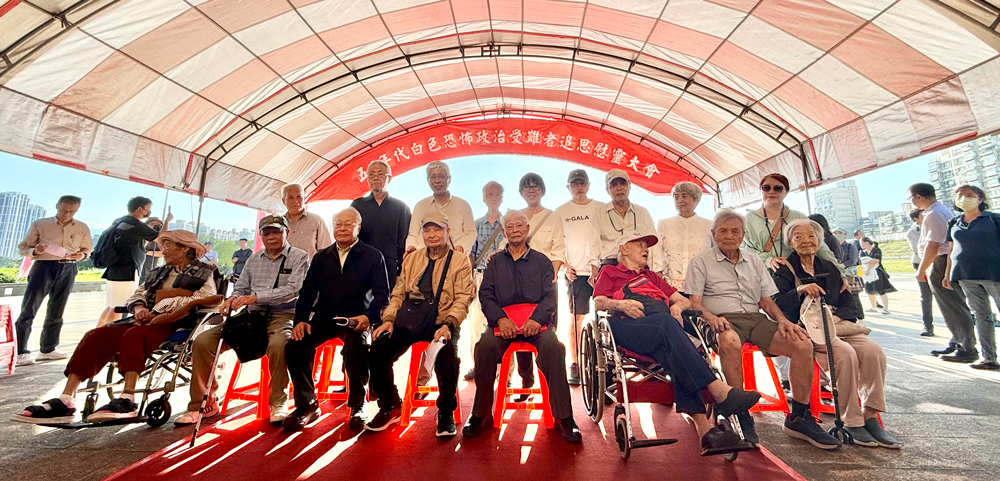2025年,马场町秋祭,十几位1950年代“白色恐怖”受难者在现场唱《青春战斗曲》。第一排,右一为“邮电支部案”的周淑贞,右二为“台湾民主自治同盟案”的林金成,右四为“义民中学案”的范荣枝;第二排,右二为李苍降烈士在狱中出生的女儿李素慧,右三是参加抗美援朝为美军所俘后被遣送至台的赵英魁。