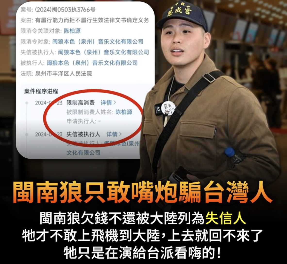 探寻两人狼狈为奸的缘由,人们意外扒出,在陈柏源大放厥词之前,同年5月,他及旗下音乐厂牌“闽狼本色”因劳资争议拒绝履行法律义务,已经被福建省泉州市地方法院列为失信被执行人。