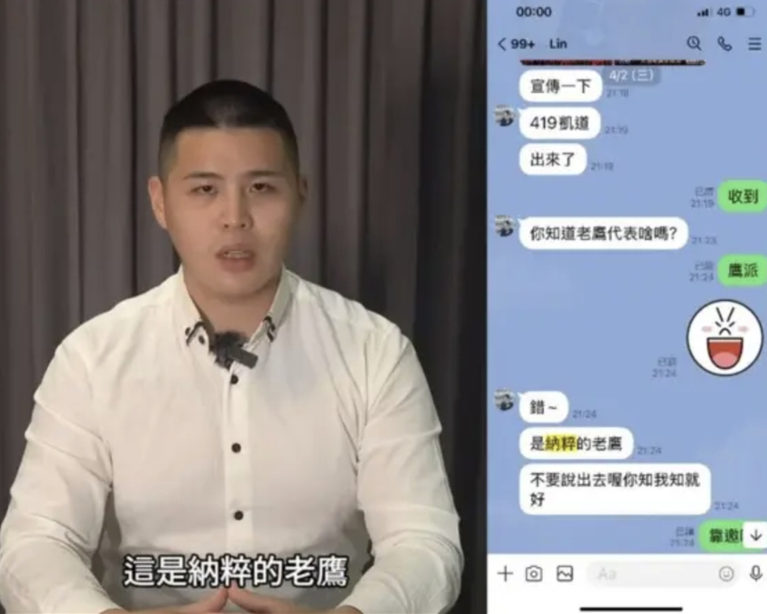 陈柏源声称,4月的一场游行前,温子渝曾转发给他多张纳粹老鹰图样与希特勒军徽图像作参考,并交代他不要说出去。温甚至扬言要成立所谓“纳粹冲锋队”,在台湾推动支持“反共”和“大罢免”的政治行动。